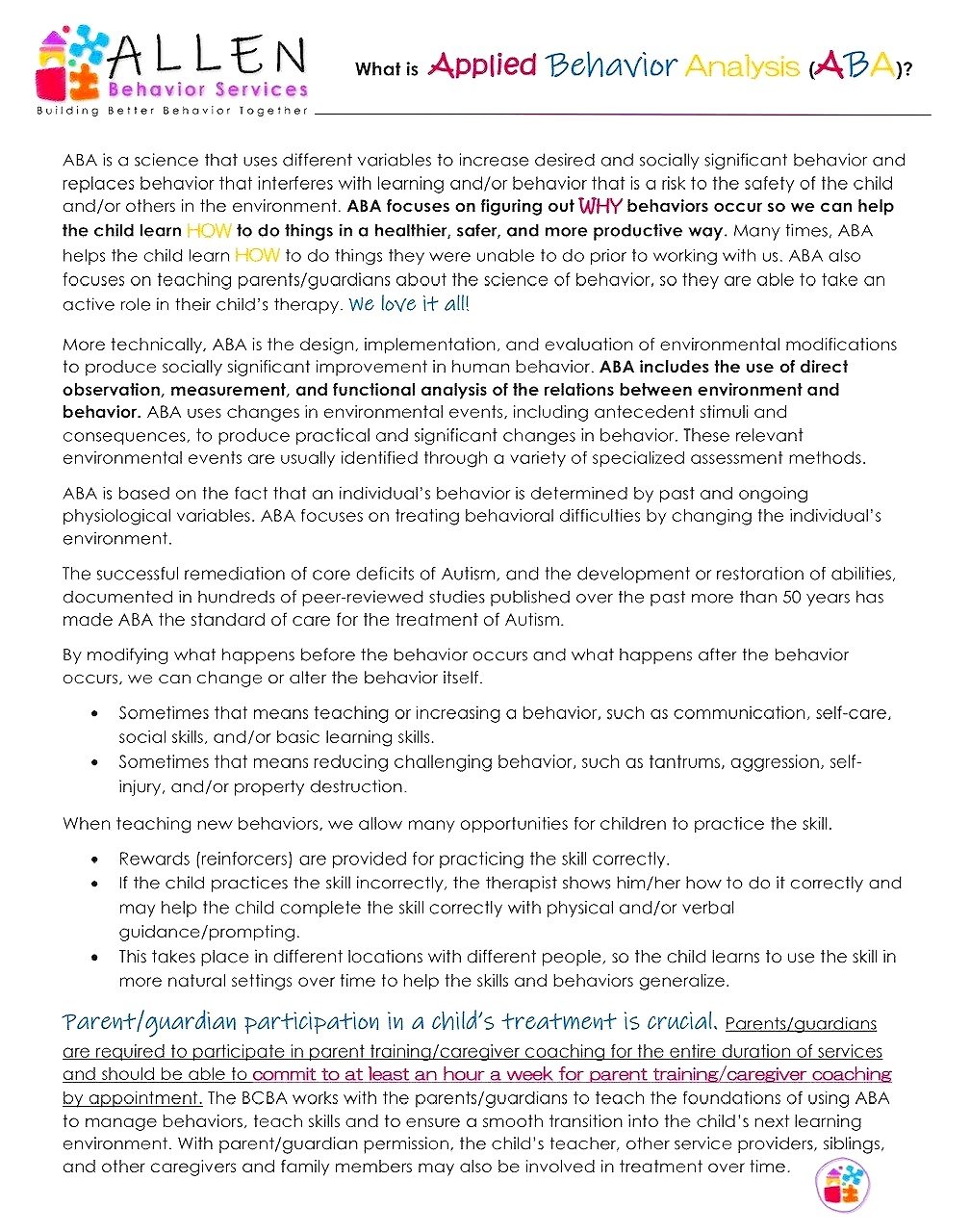At Allen Behavior Services, we use principles of behavior to teach new skills, increase positive behaviors, and reduce challenging behaviors to help develop important life skills, improve social communication, and increase overall independence in the home, school, and community.